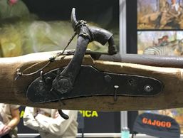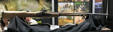 I discovered this gun at the recent Safari Club Int. show in Reno. This gun was confiscated in Mozambique by Gajogo Safarilands from locals. The barrel is a Toyota truck axle, the lock is hand made, as is the nipple. The stock, while crude, vaguely resembles a true muzzleloading stock and even has vestigial panels on the left side.
